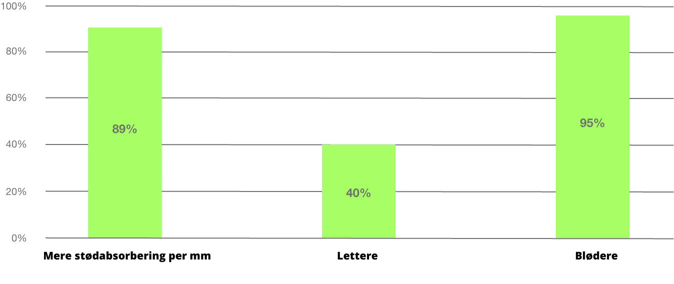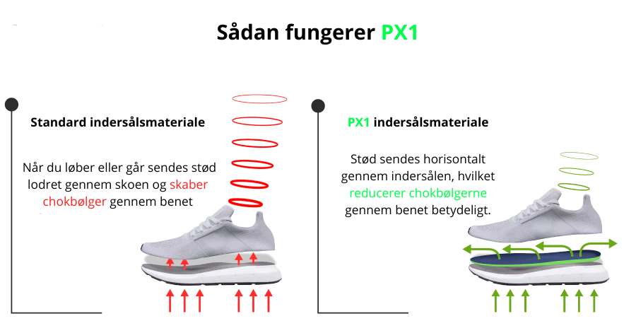 Feedback fra eliteløbere konkluderede, at de ønskede lettere indlægssåler, mere stødabsorbering, samtidig med at de havde den vigtige beskyttelse mod skader. Efter flere års udvikling og over 20 års viden inden for indlægssålsbranchen har vi lanceret PX1 stødabsorberende teknologi. Denne materialeteknologi er den første, der er udviklet specifikt til at beskytte fødder og krop mod jordkræfter. Se følgende graf for at sammenligne med de førende indersåls konkurrenter